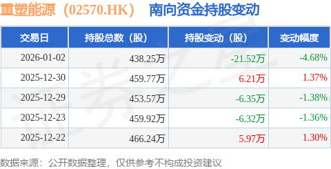 证券之星消息,1月2日南向资金减持21.52万股重塑能源(02570.HK)。近5个交易日中,获南向资金减持的有3天,累计净减持22.02万股。近20个交易日中,获南向资金增持的有12天,累计净增持281.29万股。截至目前,南向资金持有重塑能源(02570.HK)438.25万股,占公司已发行普通股的7.6%。