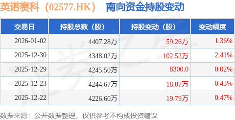 证券之星消息,1月2日南向资金增持59.26万股英诺赛科(02577.HK)。近5个交易日中,获南向资金增持的有5天,累计净增持200.47万股。近20个交易日中,获南向资金增持的有10天,累计净增持37.3万股。截至目前,南向资金持有英诺赛科(02577.HK)4407.28万股,占公司已发行普通股的8.38%。