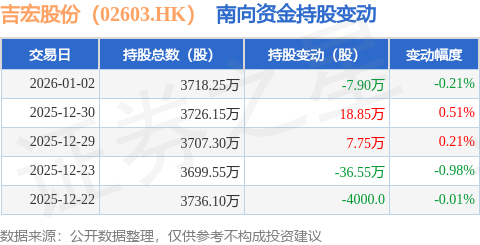 证券之星消息,1月2日南向资金减持7.9万股吉宏股份(02603.HK)。近5个交易日中,获南向资金减持的有3天,累计净减持18.25万股。近20个交易日中,获南向资金增持的有11天,累计净增持1441.6万股。截至目前,南向资金持有吉宏股份(02603.HK)3718.25万股,占公司已发行普通股的54.74%。