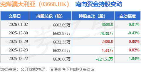 证券之星消息,1月2日南向资金减持8600.0股兖煤澳大利亚(03668.HK)。近5个交易日中,获南向资金减持的有3天,累计净减持152.08万股。近20个交易日中,获南向资金减持的有13天,累计净减持2486.61万股。截至目前,南向资金持有兖煤澳大利亚(03668.HK)6603.09万股,占公司已发行普通股的4.99%。