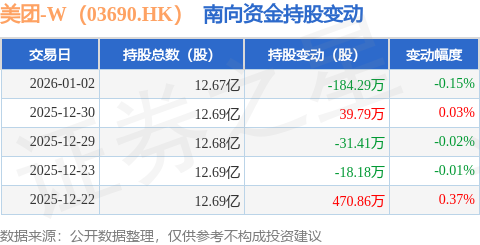 证券之星消息,1月2日南向资金减持184.29万股美团-W(03690.HK)。近5个交易日中,获南向资金增持的有2天,累计净增持276.77万股。近20个交易日中,获南向资金增持的有16天,累计净增持8341.72万股。截至目前,南向资金持有美团-W(03690.HK)12.67亿股,占公司已发行普通股的20.72%。