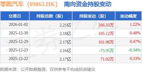 证券之星消息,1月2日南向资金增持266.33万股零跑汽车(09863.HK)。近5个交易日中,获南向资金增持的有4天,累计净增持470.5万股。近20个交易日中,获南向资金增持的有15天,累计净增持3322.25万股。截至目前,南向资金持有零跑汽车(09863.HK)2.21亿股,占公司已发行普通股的19.52%。