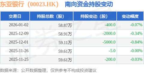 证券之星消息,1月2日南向资金减持400.0股东亚银行(00023.HK)。近5个交易日中,获南向资金减持的有5天,累计净减持7605.0股。近20个交易日中,获南向资金减持的有20天,累计净减持7.96万股。截至目前,南向资金持有东亚银行(00023.HK)58.87万股,占公司已发行普通股的0.01%。