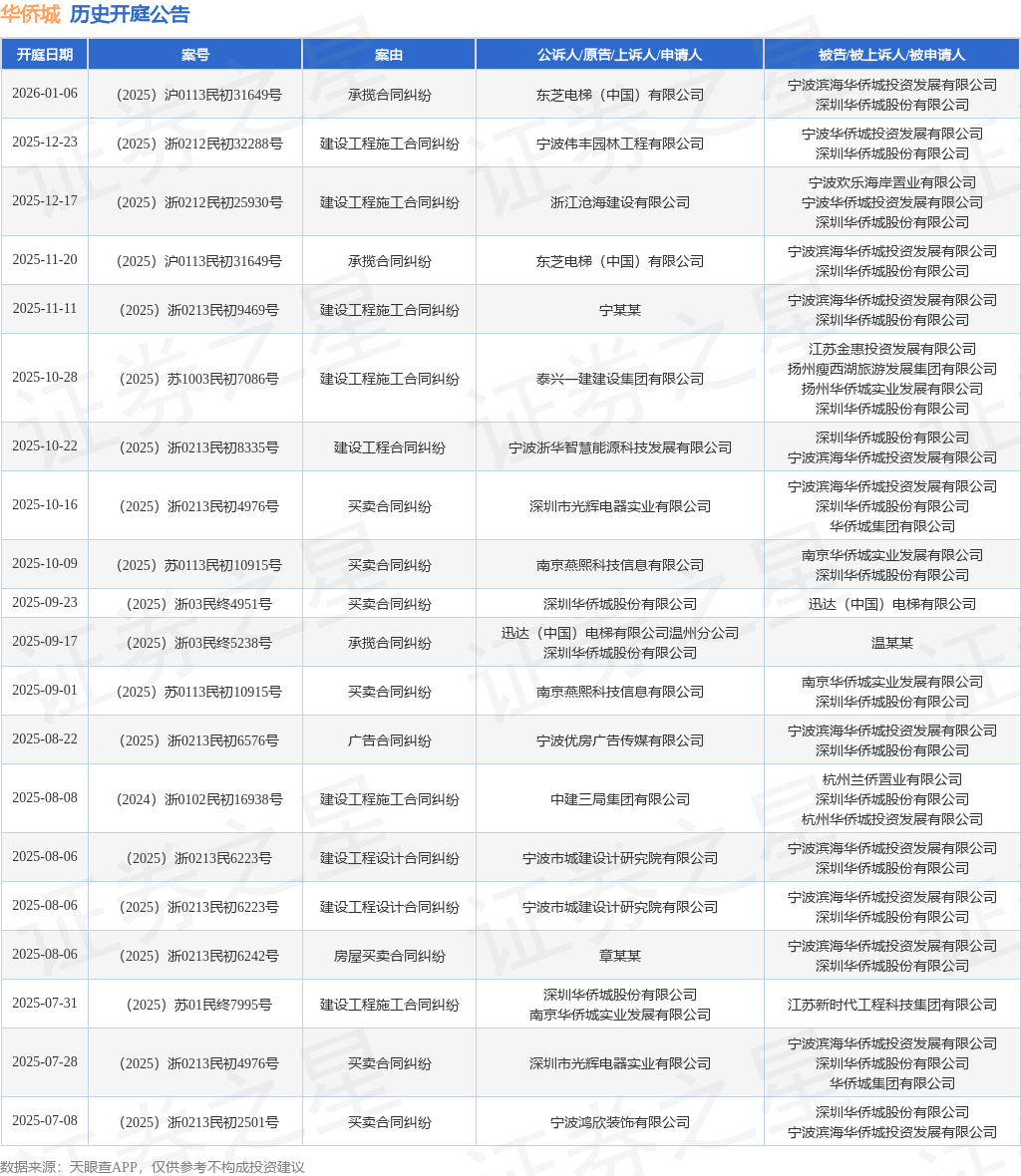 案号:(2025)沪0113民初31649号根据统计,近一年内以深圳华侨城股份有限公司为当事人的历史开庭公告有55则,其中案由为“买卖合同纠纷”的公告以19则居首,其次为“建设工程施工合同纠纷”有15则,“承揽合同纠纷”有6则。历史开庭公告(前20条)如下: