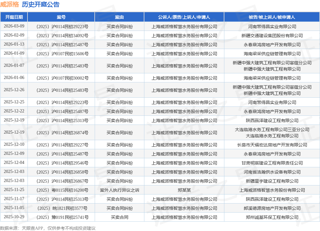 案号:(2025)沪0107民初30002号根据统计,近一年内以上海威派格智慧水务股份有限公司为当事人的历史开庭公告有61则,其中案由为“买卖合同纠纷”的公告以51则居首,其次为“合同纠纷”有4则,“服务合同纠纷”有3则。历史开庭公告(前20条)如下: