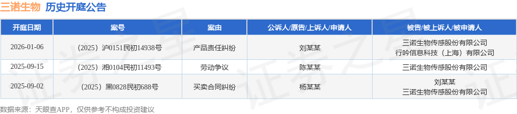 案号:(2025)沪0151民初14938号根据统计,近一年内以三诺生物传感股份有限公司为当事人的历史开庭公告有3则,其中案由为“买卖合同纠纷”的公告以1则居首,其次为“产品责任纠纷”有1则,“劳动争议”有1则。历史开庭公告如下: