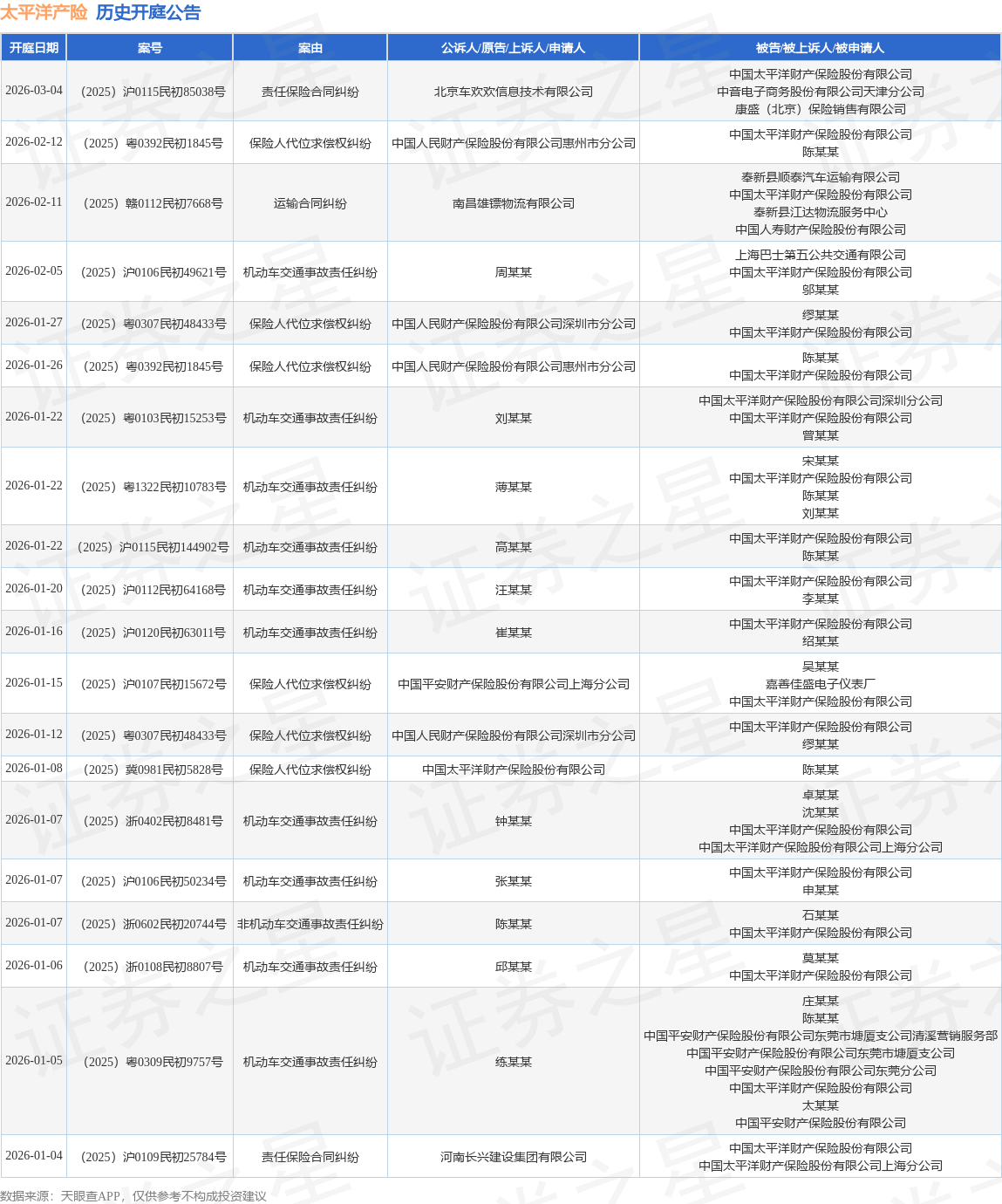 案号:(2025)浙0108民初8807号根据统计,近一年内以中国太平洋财产保险股份有限公司为当事人的历史开庭公告有685则,其中案由为“机动车交通事故责任纠纷”的公告以446则居首,其次为“保险人代位求偿权纠纷”有79则,“非机动车交通事故责任纠纷”有29则。历史开庭公告(前20条)如下: