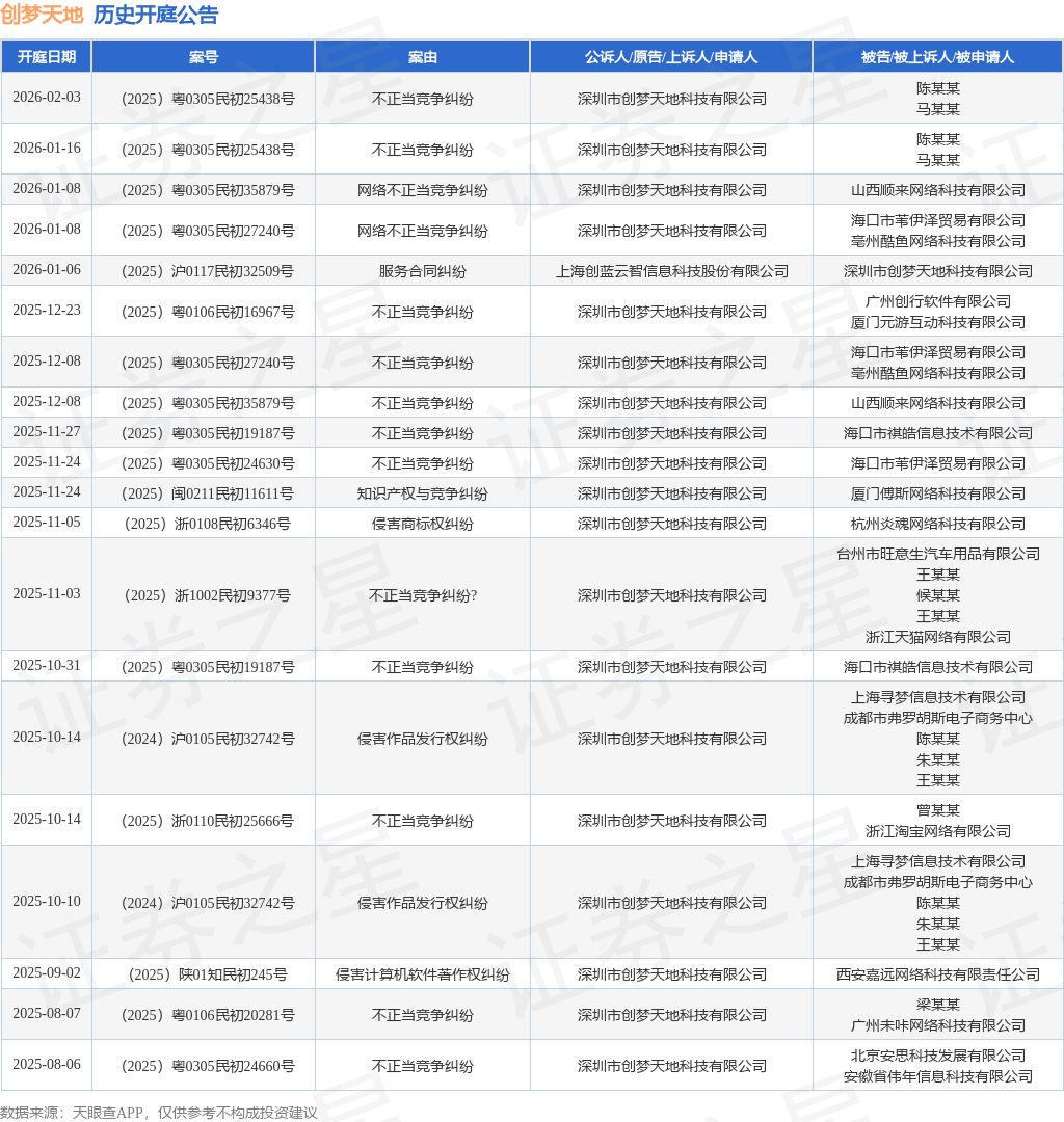 案号:(2025)沪0117民初32509号根据统计,近一年内以深圳市创梦天地科技有限公司为当事人的历史开庭公告有84则,其中案由为“不正当竞争纠纷”的公告以26则居首,其次为“网络不正当竞争纠纷”有24则,“侵害计算机软件著作权纠纷”有8则。历史开庭公告(前20条)如下: