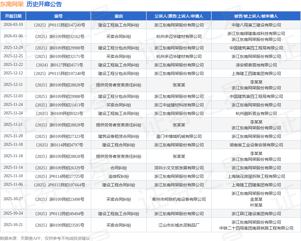 案号:(2025)浙0109民初32162号根据统计,近一年内以浙江东南网架股份有限公司为当事人的历史开庭公告有65则,其中案由为“建设工程施工合同纠纷”的公告以18则居首,其次为“买卖合同纠纷”有13则,“建设工程分包合同纠纷”有10则。历史开庭公告(前20条)如下: