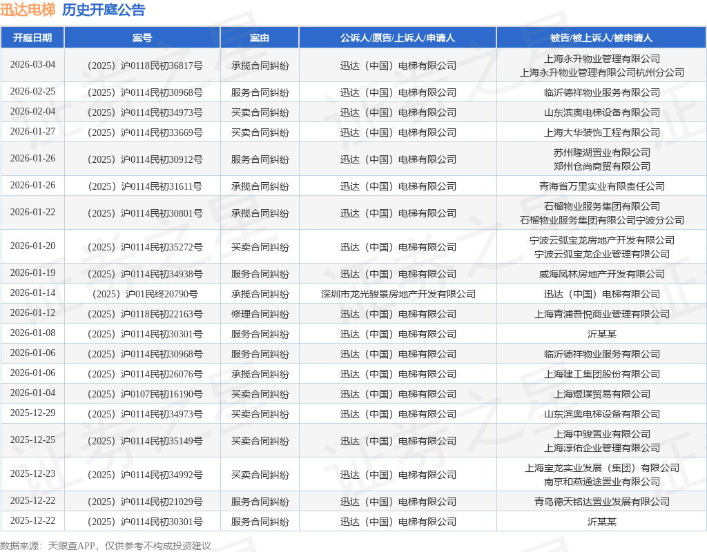 案号:(2025)沪0114民初26076号根据统计,近一年内以迅达(中国)电梯有限公司为当事人的历史开庭公告有223则,其中案由为“买卖合同纠纷”的公告以131则居首,其次为“承揽合同纠纷”有32则,“修理合同纠纷”有16则。历史开庭公告(前20条)如下:
