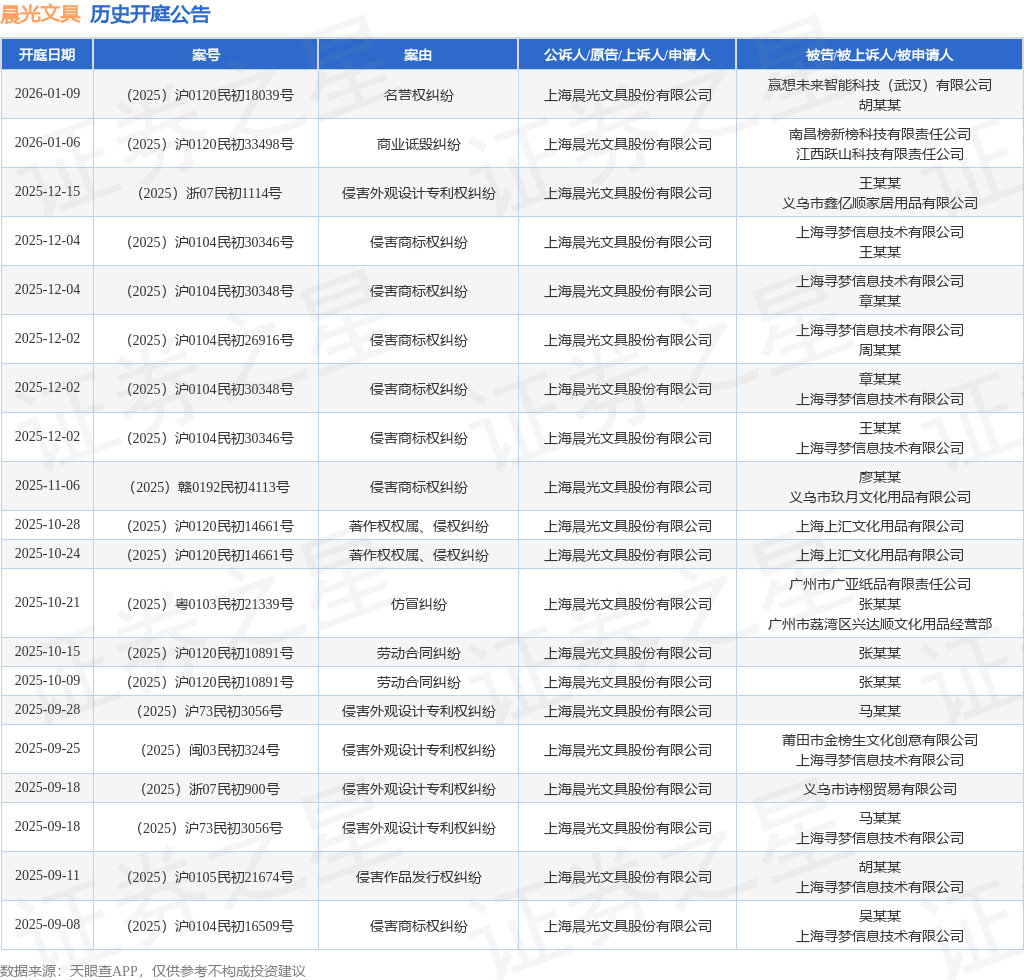 案号:(2025)沪0120民初33498号根据统计,近一年内以上海晨光文具股份有限公司为当事人的历史开庭公告有45则,其中案由为“侵害商标权纠纷”的公告以15则居首,其次为“侵害外观设计专利权纠纷”有11则,“劳动合同纠纷”有6则。历史开庭公告(前20条)如下: