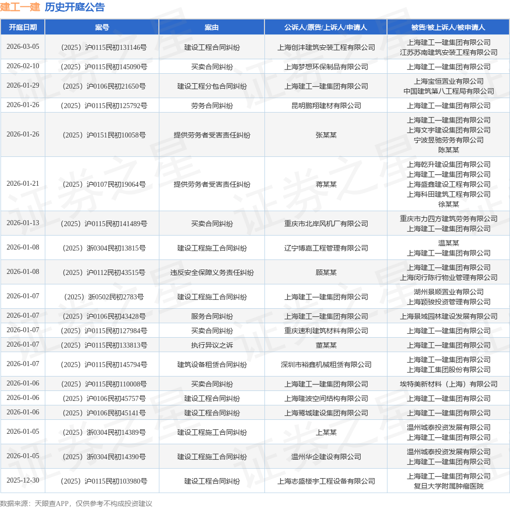 案号:(2025)沪0115民初110008号根据统计,近一年内以上海建工一建集团有限公司为当事人的历史开庭公告有286则,其中案由为“买卖合同纠纷”的公告以78则居首,其次为“建设工程施工合同纠纷”有38则,“建设工程分包合同纠纷”有34则。历史开庭公告(前20条)如下: