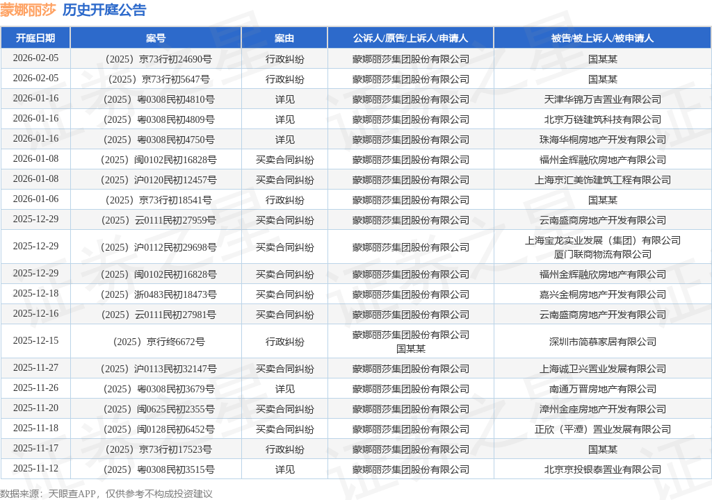 案号:(2025)京73行初18541号根据统计,近一年内以蒙娜丽莎集团股份有限公司为当事人的历史开庭公告有197则,其中案由为“买卖合同纠纷”的公告以136则居首,其次为“行政纠纷”有34则,“其他”有10则。历史开庭公告(前20条)如下: