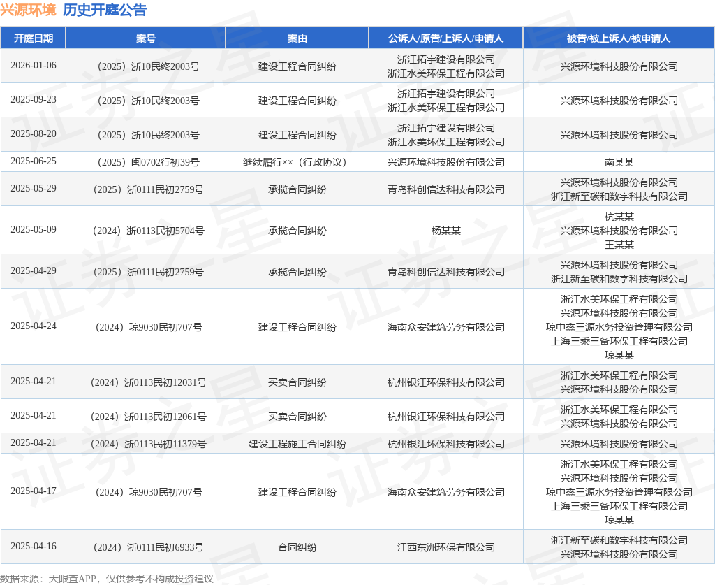 案号:(2025)浙10民终2003号根据统计,近一年内以兴源环境科技股份有限公司为当事人的历史开庭公告有13则,其中案由为“建设工程合同纠纷”的公告以5则居首,其次为“承揽合同纠纷”有3则,“买卖合同纠纷”有2则。历史开庭公告如下: