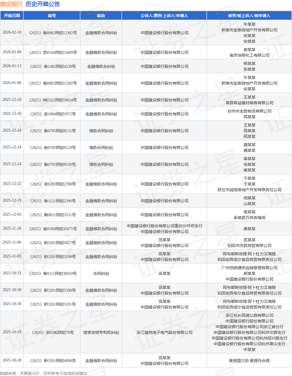 案号:(2025)鲁0982民初12302号根据统计,近一年内以中国建设银行股份有限公司为当事人的历史开庭公告有112则,其中案由为“金融借款合同纠纷”的公告以64则居首,其次为“合同纠纷”有7则,“侵害发明专利权纠纷”有6则。历史开庭公告(前20条)如下: