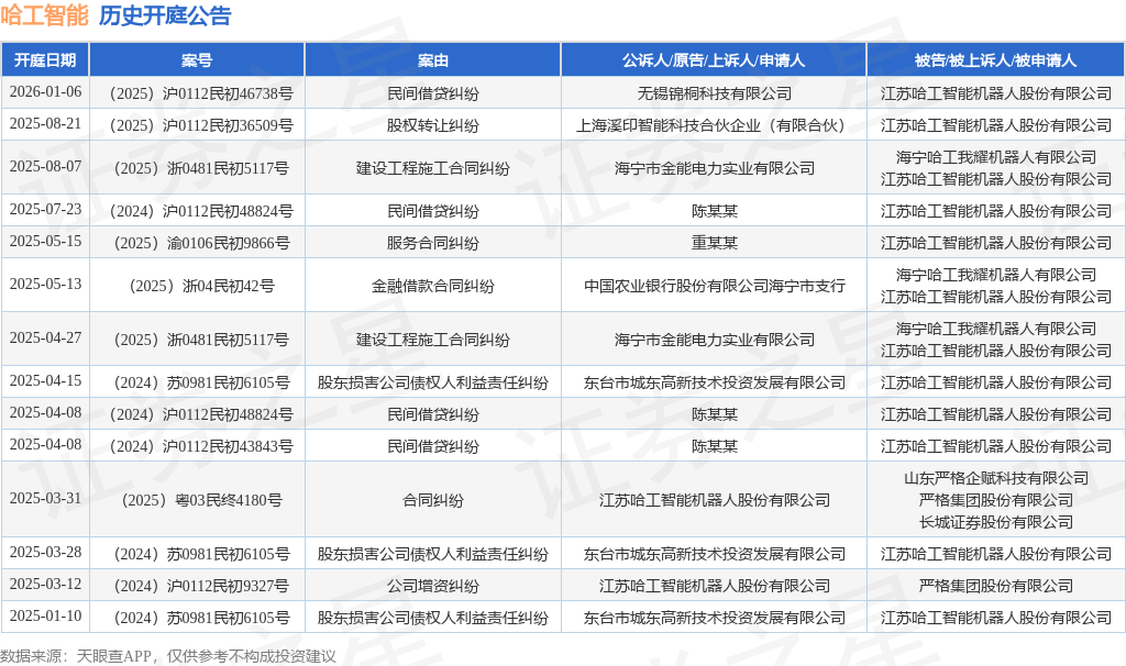 案号:(2025)沪0112民初46738号根据统计,近一年内以江苏哈工智能机器人股份有限公司为当事人的历史开庭公告有14则,其中案由为“民间借贷纠纷”的公告以4则居首,其次为“股东损害公司债权人利益责任纠纷”有3则,“建设工程施工合同纠纷”有2则。历史开庭公告如下: