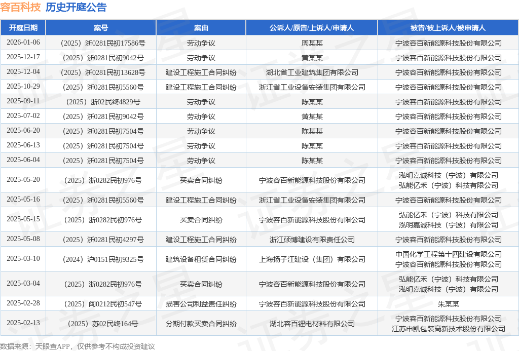 案号:(2025)浙0281民初17586号根据统计,近一年内以宁波容百新能源科技股份有限公司为当事人的历史开庭公告有17则,其中案由为“劳动争议”的公告以7则居首,其次为“建设工程施工合同纠纷”有4则,“买卖合同纠纷”有3则。历史开庭公告如下: