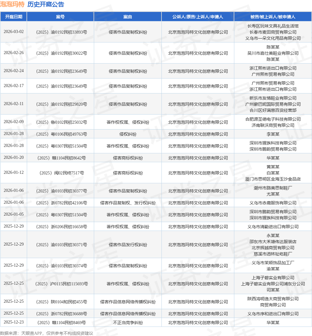 案号:(2025)渝0103民初30377号根据统计,近一年内以北京泡泡玛特文化创意有限公司为当事人的历史开庭公告有93则,其中案由为“著作权权属、侵权纠纷”的公告以29则居首,其次为“侵害作品复制权纠纷”有21则,“侵害商标权纠纷”有13则。历史开庭公告(前20条)如下: