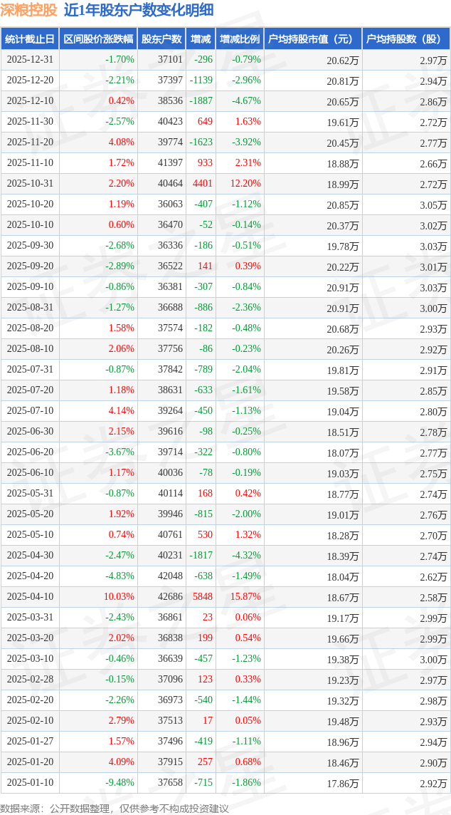 从股价来看,2025年12月20日至2025年12月31日,深粮控股区间跌幅为1.7%,在此期间股东户数减少296.0户,减幅为0.79%。