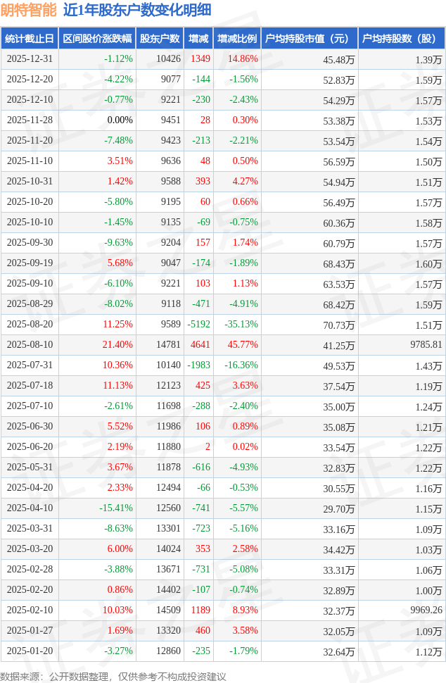 从股价来看,2025年12月20日至2025年12月31日,朗特智能区间跌幅为1.12%,在此期间股东户数增加1349.0户,增幅为14.86%。