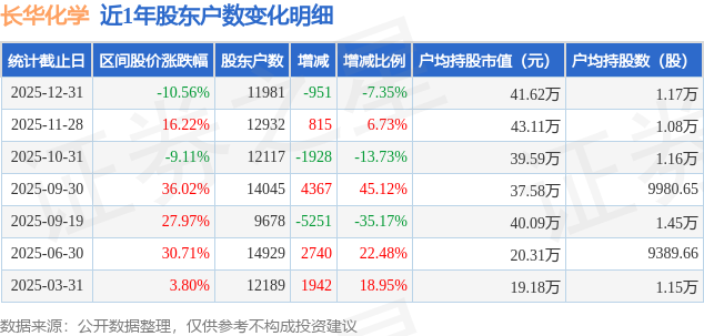 从股价来看,2025年11月28日至2025年12月31日,长华化学区间跌幅为10.56%,在此期间股东户数减少951.0户,减幅为7.35%。