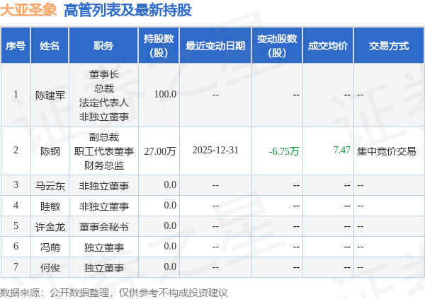 大亚圣象的高管列表及最新持股情况如下: