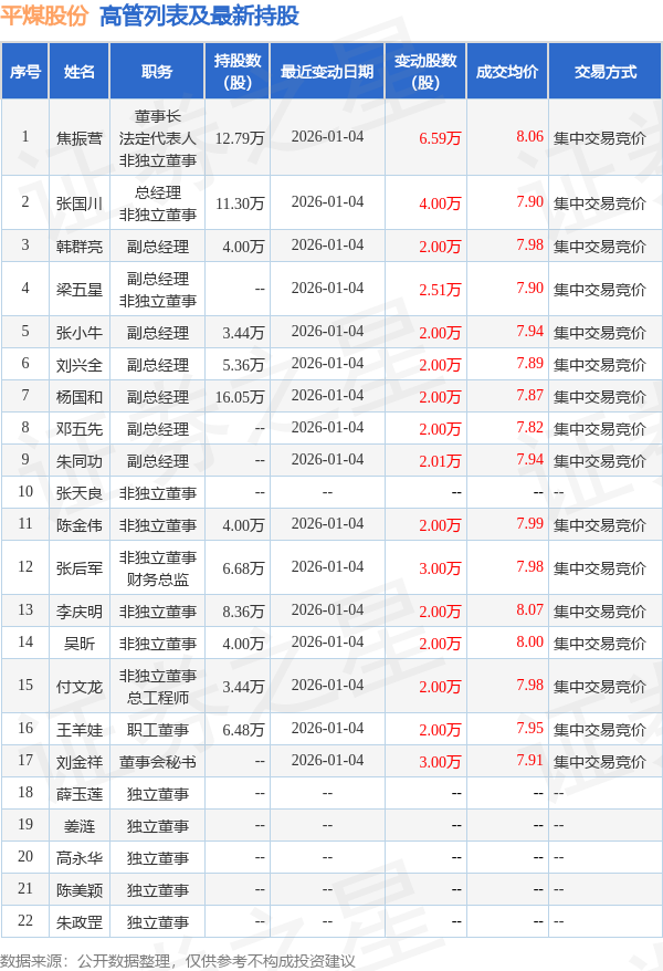 证券之星消息,根据1月4日市场公开信息、上市公司公告及交易所披露数据整理,平煤股份(601666)最新董监高及相关人员股份变动情况:2026年1月4日公司董事长焦振营、董事,总经理张国川、副总经理韩群亮、董事,副总经理梁五星、副总经理张小牛、副总经理刘兴全、副总经理杨国和、副总经理邓五先、副总经理朱同功、董事陈金伟、董事,财务总监张后军、党委书记,董事李庆明、董事吴昕、董事,总工程师付文龙、职工董事王羊娃、董事会秘书刘金祥共增持公司股份41.11万股,占公司总股本为0.0165%。变动期间公司股价上涨0.0%,12月31日当日收盘报7.87元。