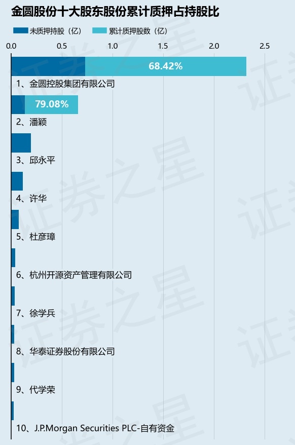 截止本公告日,股东金圆控股集团有限公司已累计质押股份1.59亿股,占其持股总数的68.42%,股东潘颖已累计质押股份5230.0万股,占其持股总数的79.08%。本次质押后金圆股份十大股东的累计质押股份占持股比例(占持股比例的计算以公司最新一期财务报表公布的十大股东的持股总数为基准)见下图: