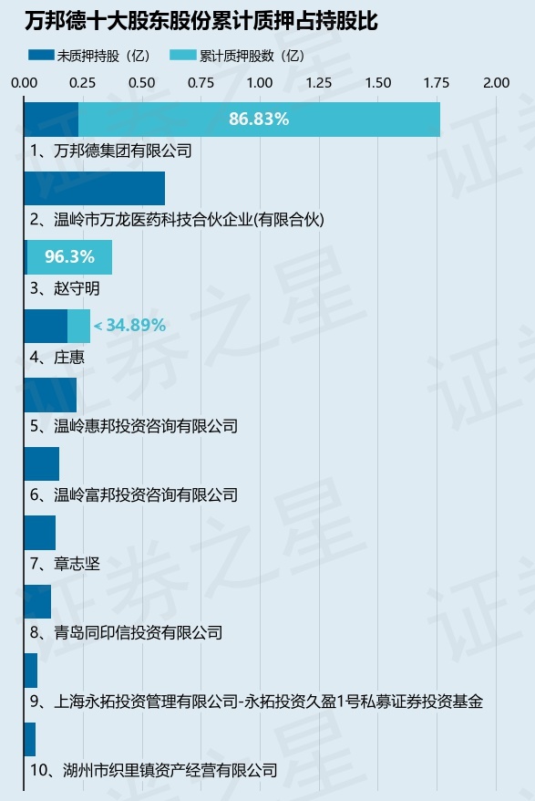 截止本公告日,股东万邦德集团有限公司已累计质押股份1.53亿股,占其持股总数的86.83%,股东赵守明已累计质押股份3588.96万股,占其持股总数的96.3%,股东庄惠已累计质押股份985.0万股,占其持股总数的34.89%。本次质押后万邦德十大股东的累计质押股份占持股比例(占持股比例的计算以公司最新一期财务报表公布的十大股东的持股总数为基准)见下图:
