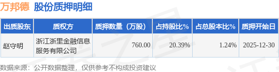 证券之星消息,万邦德(002082)1月4日公开信息显示,股东赵守明向浙江浙里金融信息服务有限公司合计质押760.0万股,占总股本1.24%。质押详情见下表: