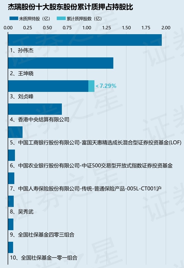 截止本公告日,股东刘贞峰已累计质押股份800.0万股,占其持股总数的7.29%。本次质押后杰瑞股份十大股东的累计质押股份占持股比例(占持股比例的计算以公司最新一期财务报表公布的十大股东的持股总数为基准)见下图:
