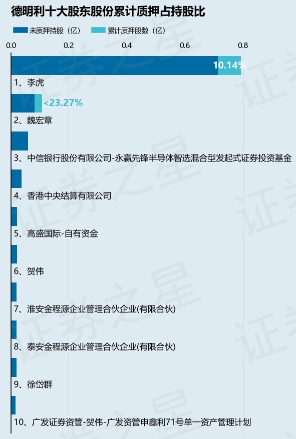 截止本公告日,股东李虎已累计质押股份805.0万股,占其持股总数的10.14%,股东魏宏章已累计质押股份250.0万股,占其持股总数的23.27%。本次质押后德明利十大股东的累计质押股份占持股比例(占持股比例的计算以公司最新一期财务报表公布的十大股东的持股总数为基准)见下图: