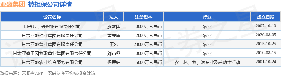亚盛集团12月31日披露5笔对外担保,被担保公司5家。对外担保明细如下表: