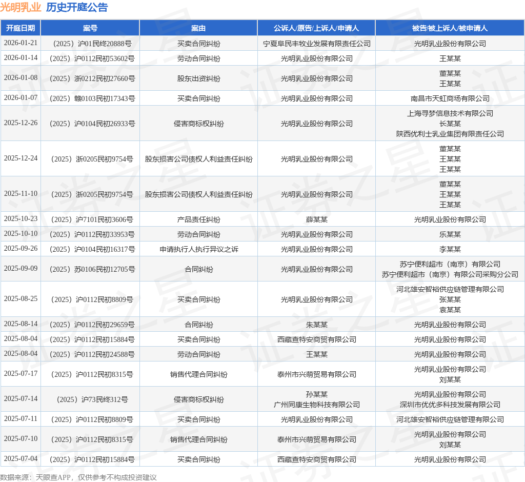 案号:(2025)赣0103民初17343号根据统计,近一年内以光明乳业股份有限公司为当事人的历史开庭公告有44则,其中案由为“买卖合同纠纷”的公告以13则居首,其次为“侵害商标权纠纷”有9则,“劳动合同纠纷”有7则。历史开庭公告(前20条)如下: