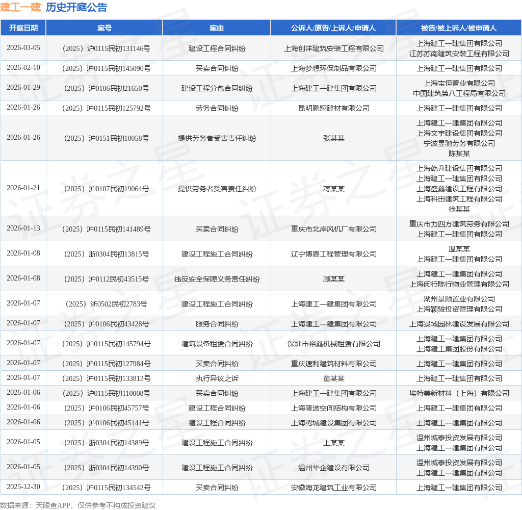 案号:(2025)沪0115民初133813号根据统计,近一年内以上海建工一建集团有限公司为当事人的历史开庭公告有285则,其中案由为“买卖合同纠纷”的公告以78则居首,其次为“建设工程施工合同纠纷”有38则,“建设工程分包合同纠纷”有33则。历史开庭公告(前20条)如下: