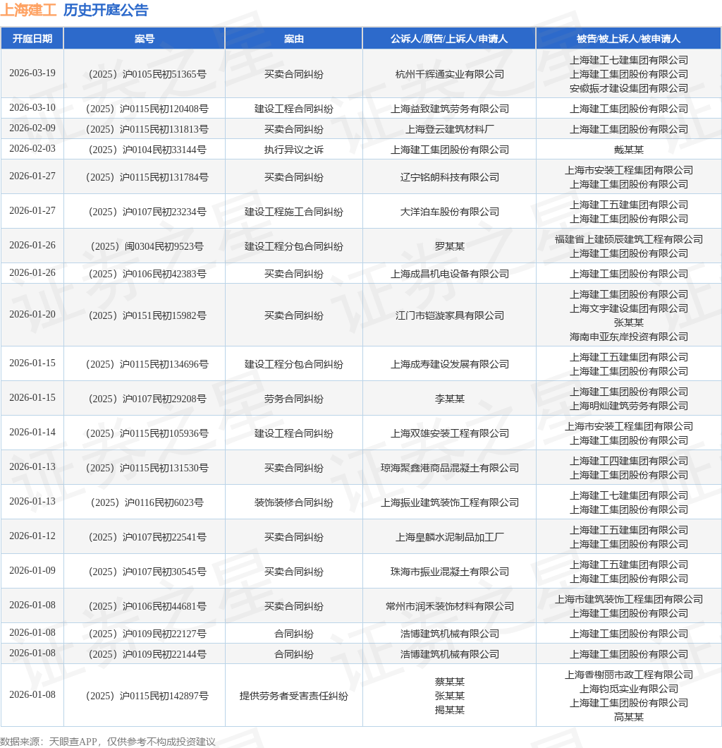 案号:(2025)沪0115民初90640号根据统计,近一年内以上海建工集团股份有限公司为当事人的历史开庭公告有458则,其中案由为“买卖合同纠纷”的公告以123则居首,其次为“建设工程施工合同纠纷”有84则,“案外人执行异议之诉”有48则。历史开庭公告(前20条)如下: