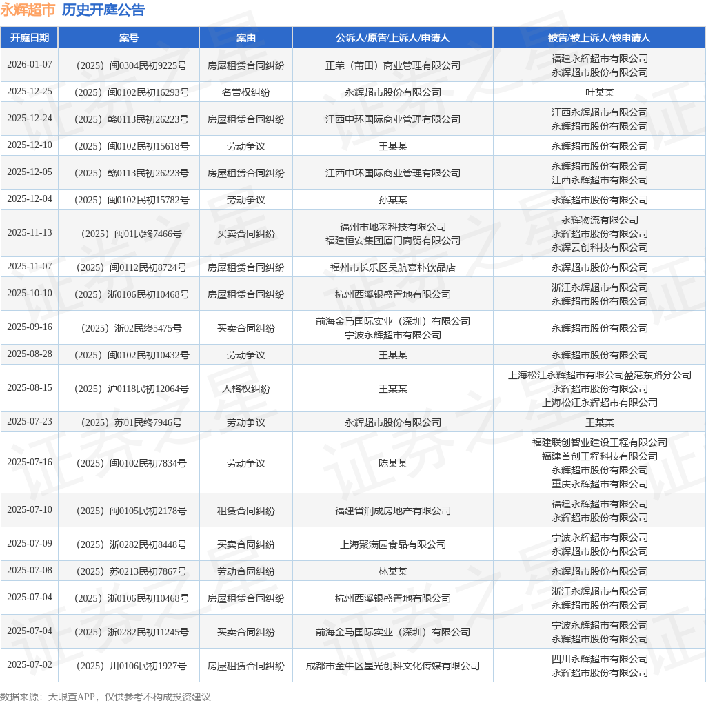 案号:(2025)闽0304民初9225号根据统计,近一年内以永辉超市股份有限公司为当事人的历史开庭公告有35则,其中案由为“房屋租赁合同纠纷”的公告以12则居首,其次为“买卖合同纠纷”有8则,“劳动争议”有7则。历史开庭公告(前20条)如下: