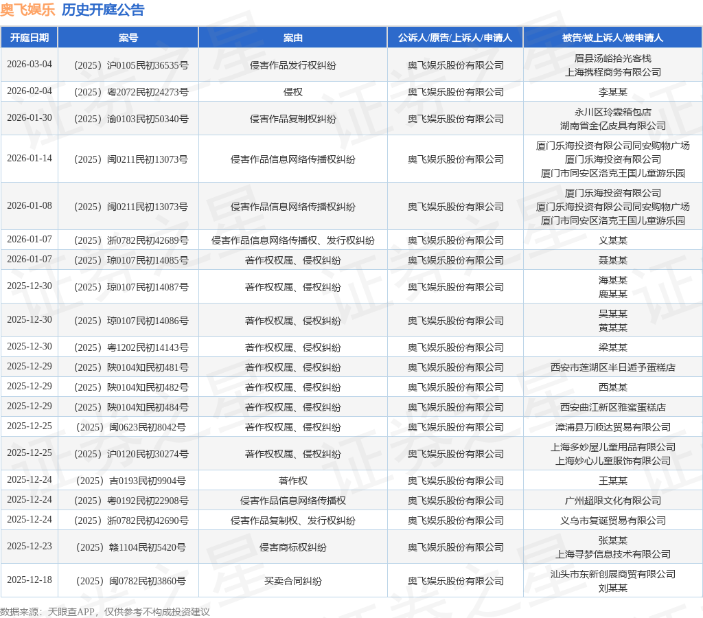 案号:(2025)琼0107民初14085号根据统计,近一年内以奥飞娱乐股份有限公司为当事人的历史开庭公告有324则,其中案由为“著作权权属、侵权纠纷”的公告以147则居首,其次为“侵害作品发行权纠纷”有54则,“侵害作品信息网络传播权纠纷”有28则。历史开庭公告(前20条)如下: