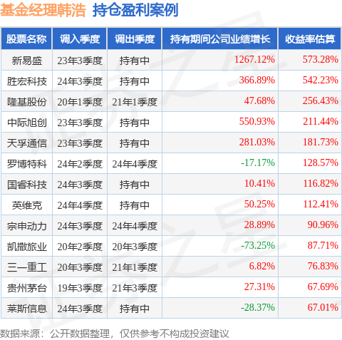 韩浩管理的中航机遇领航混合发起A基金在23年3季度买入新易盛,已连续持有2年又1个季度。持有期间的估算收益率为573.28%,持有期间新易盛在2023年到2025年的中报归属净利润增幅达1267.12%。