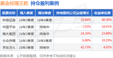 王乾管理的永赢惠泽一年基金在24年3季度买入中信证券,在持有1个季度后在24年4季度卖出。持有期间的估算收益率为48.36%,持有期间中信证券在2023年到2024年的年报归属净利润增幅达10.06%。