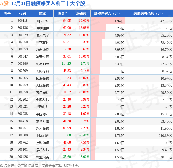 A股融资净买入前三分别为:中国卫星(600118)融资净买入11.94亿元、信维通信(300136)融资净买入5.25亿元、航天电子(600879)融资净买入4.99亿元,前20具体见下表:
