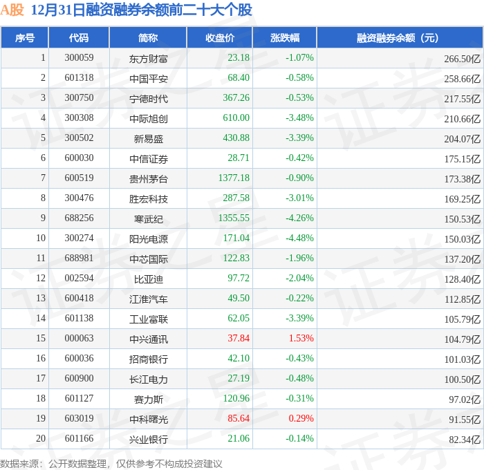 A股融资融券余额前三分别为:东方财富(300059)融资融券余额266.5亿元、中国平安(601318)融资融券余额258.66亿元、宁德时代(300750)融资融券余额217.55亿元,前20具体见下表: