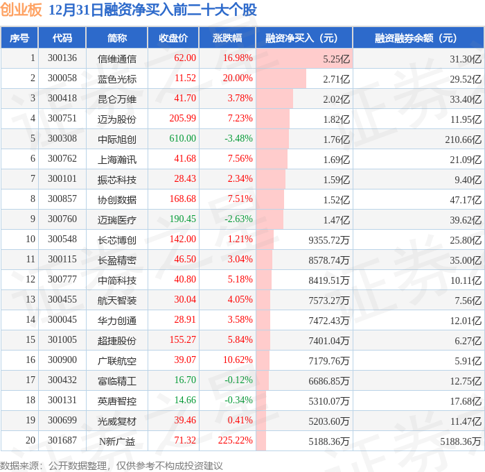 创业板融资净买入前三分别为:信维通信(300136)融资净买入5.25亿元、蓝色光标(300058)融资净买入2.71亿元、昆仑万维(300418)融资净买入2.02亿元,前20具体见下表: