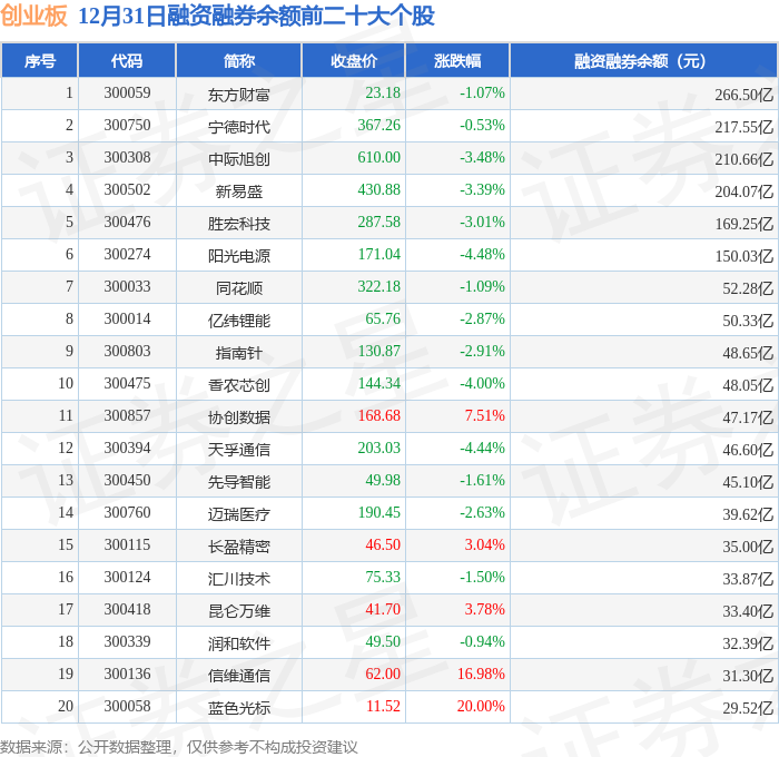 创业板融资融券余额前三分别为:东方财富(300059)融资融券余额266.5亿元、宁德时代(300750)融资融券余额217.55亿元、中际旭创(300308)融资融券余额210.66亿元,前20具体见下表: