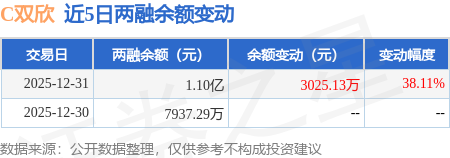 证券之星消息,12月31日,C双欣(001369)融资买入8215.02万元,融资偿还5189.89万元,融资净买入3025.13万元,融资余额1.1亿元。