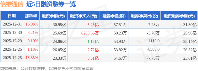 证券之星消息,截至2025年12月31日收盘,信维通信(300136)报收于62.0元,上涨16.98%,换手率24.8%,成交量204.51万手,成交额119.11亿元。