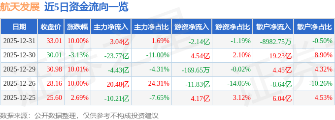 证券之星消息,截至2025年12月31日收盘,航天发展(000547)报收于33.01元,上涨10.0%,涨停,换手率35.77%,成交量568.43万手,成交额179.32亿元。