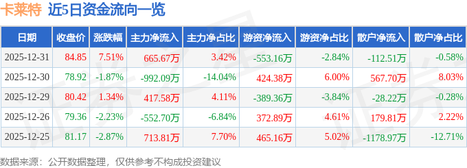 证券之星消息,截至2025年12月31日收盘,卡莱特(301391)报收于84.85元,上涨7.51%,换手率2.53%,成交量2.35万手,成交额1.94亿元。