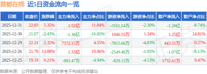 证券之星消息,截至2025年12月31日收盘,首都在线(300846)报收于22.83元,上涨5.35%,换手率15.51%,成交量60.86万手,成交额13.76亿元。