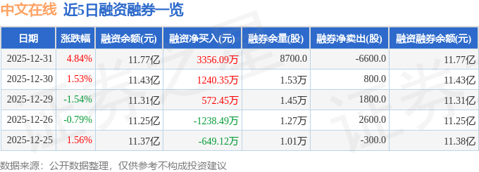 证券之星消息,截至2025年12月31日收盘,中文在线(300364)报收于25.12元,上涨4.84%,换手率10.54%,成交量69.61万手,成交额17.38亿元。